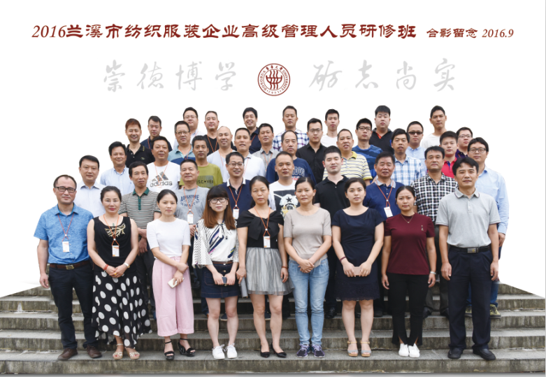近日,浙江省兰溪市纺织服装企业高级管理人员研修班在东华大学延安路校区顺利举行。本次培训班由浙江省兰溪市经信局主办、东华大学继续教育学院承办,于2016年9月19日上午开班,23日结束,持续5天时间,来自兰溪市40余家企业的董事长、总经理等参加了培训。